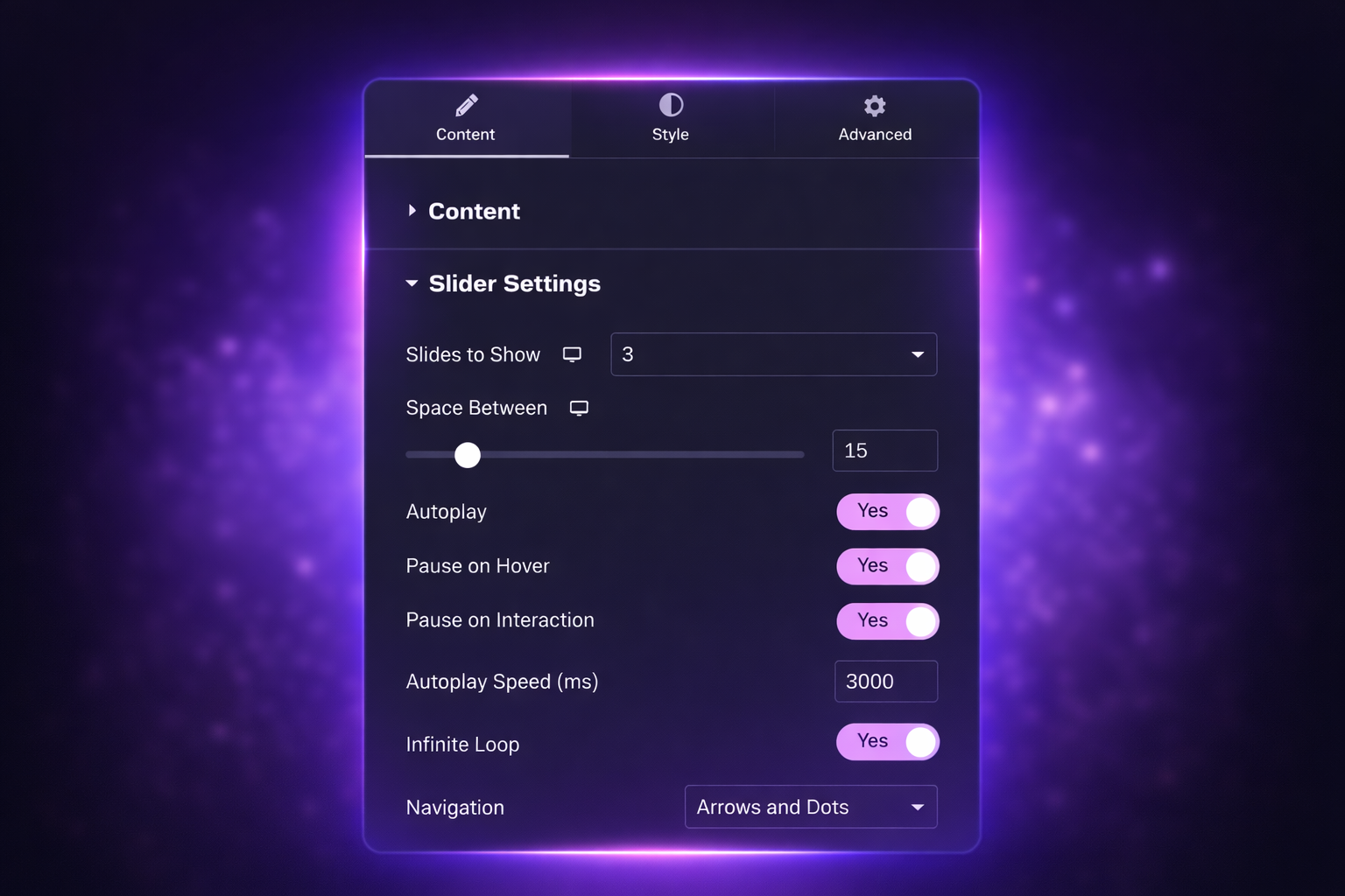 Customize slider settings (autoplay, navigation, responsive).