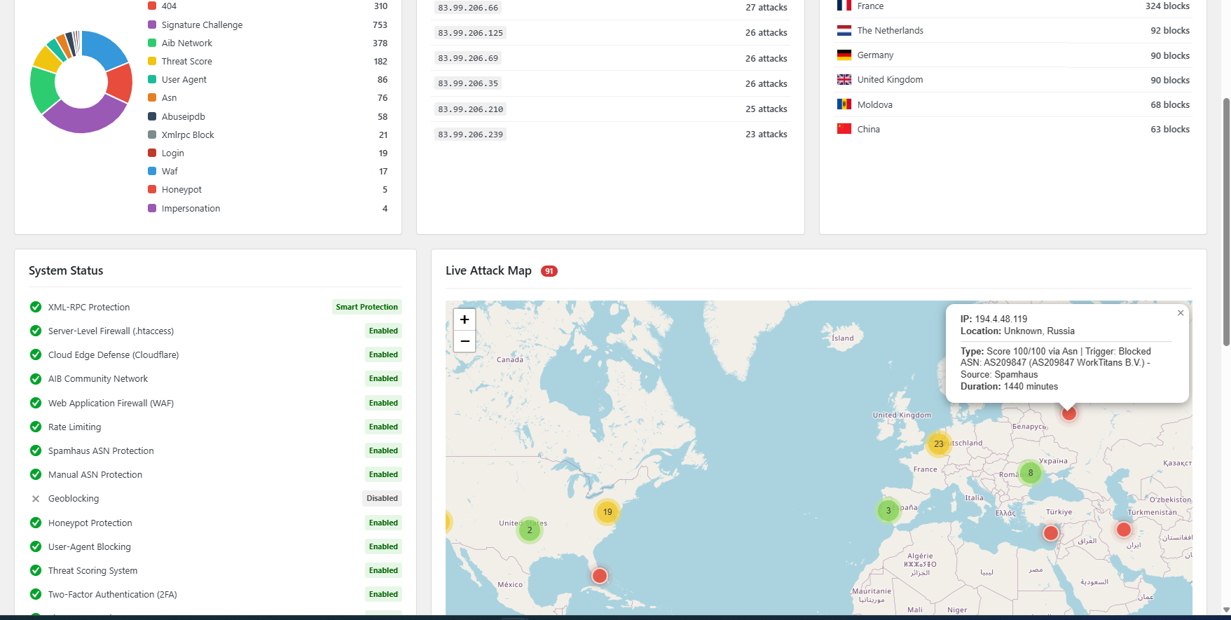* And much more: Rate Limiting, Country & ASN Blocking (with Spamhaus support), ASN Whitelisting, Push Notifications, Google reCAPTCHA, Honeypots, Active User Session Management, and Full WP-CLI Support.