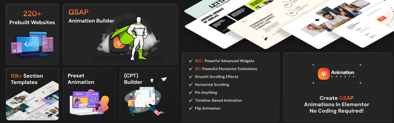 Animation Addons for Elementor is the ultimate GSAP-powered animation plugin, featuring 220+ fully built websites (including all inner pages), 100+ exclusive widgets, 25+ advanced Elementor extensions, 2,000+ professionally designed page templates, and 10,000+ modern, ready-to-use section templates.