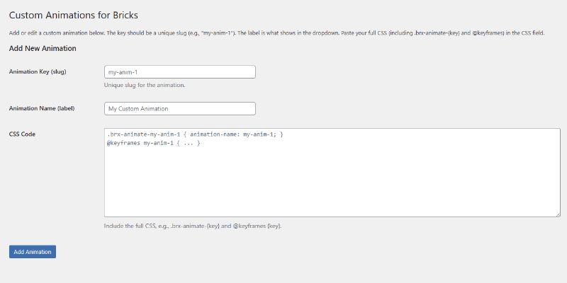 Custom Animations for Bricks is a lightweight plugin that lets you easily add custom CSS animations to your Bricks Builder sites. Through a simple admin interface, you can define animation keys, labels, and full CSS code (including @keyframes and .brx-animate- classes). These animations then appear in the Bricks Interactions panel’s “Start animation” dropdown, allowing seamless integration with triggers like viewport entry or mouse hover.