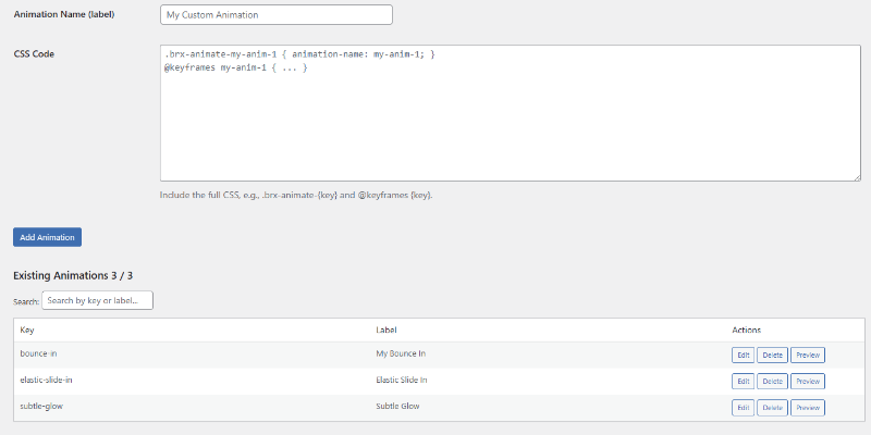 - Fill in the key (slug, e.g., “my-glow”), label (display name), and CSS (full block with .brx-animate-{key} and @keyframes).