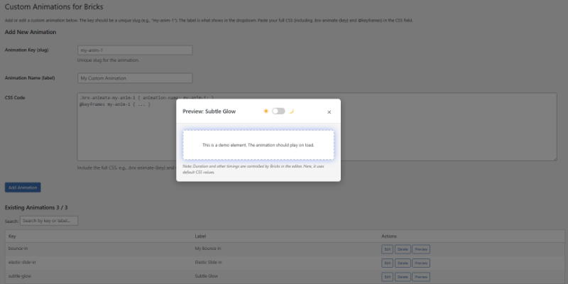 * Preview modal with dark/light mode toggle to test animations right in the admin (replays on mode switch).