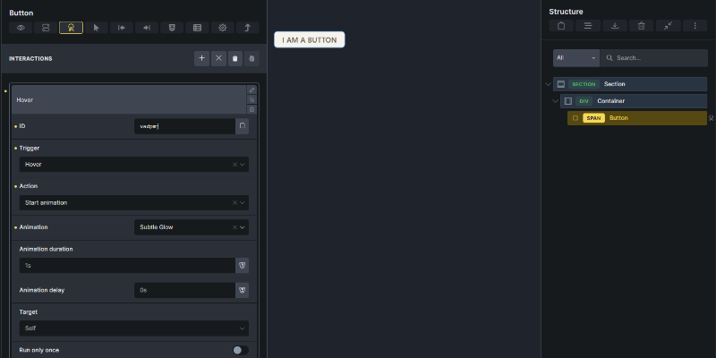 The Bricks editor Interactions panel, showing a custom animation (e.g., Subtle Glow) selected as the Action after choosing a trigger.