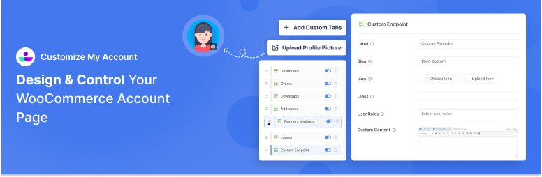 Create Custom Endpoint: Add a custom endpoint for your own using Customize My Account Page. You can specify its own label, slug, icon and personalize the page content.