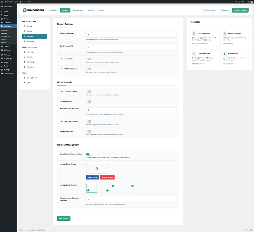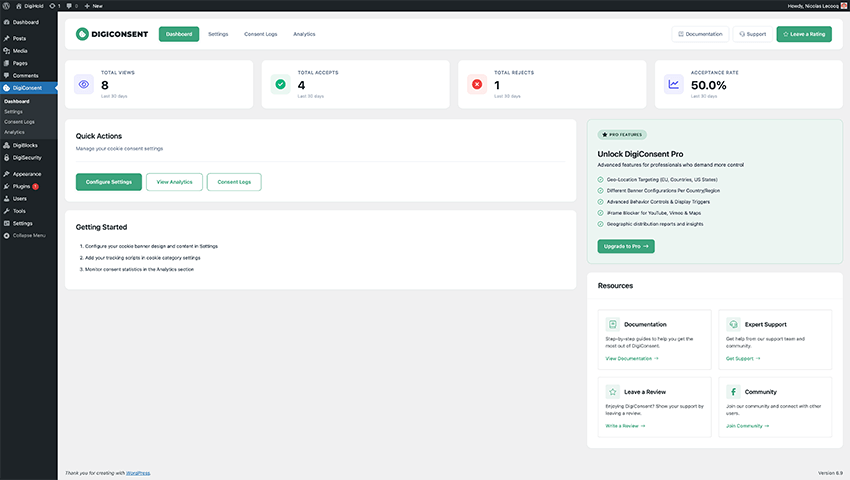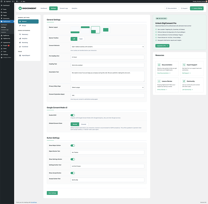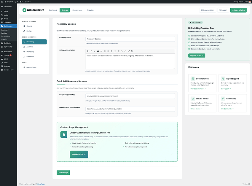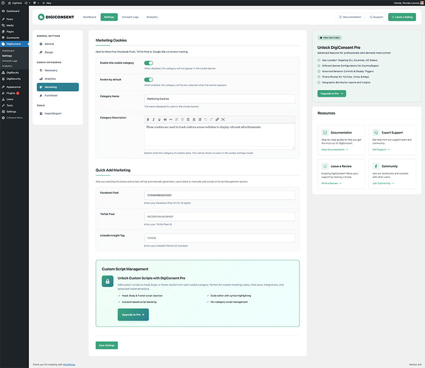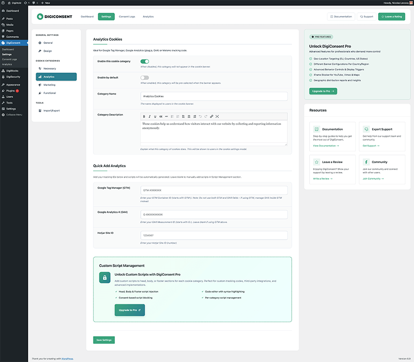 The free version includes everything you need for basic cookie compliance: cookie consent banners, quick script setup templates (Google Analytics, Facebook Pixel, etc.), consent logging, and analytics. DigiConsent Pro adds custom script management (add any JavaScript to head, body, or footer), advanced geolocation targeting, behavior controls (display delays, scroll triggers, exit intent), and regional compliance features for businesses operating in multiple countries or US states.