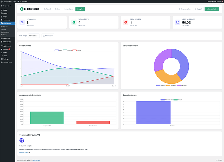 - Consent Statistics – View total accepts, rejects, and acceptance rates