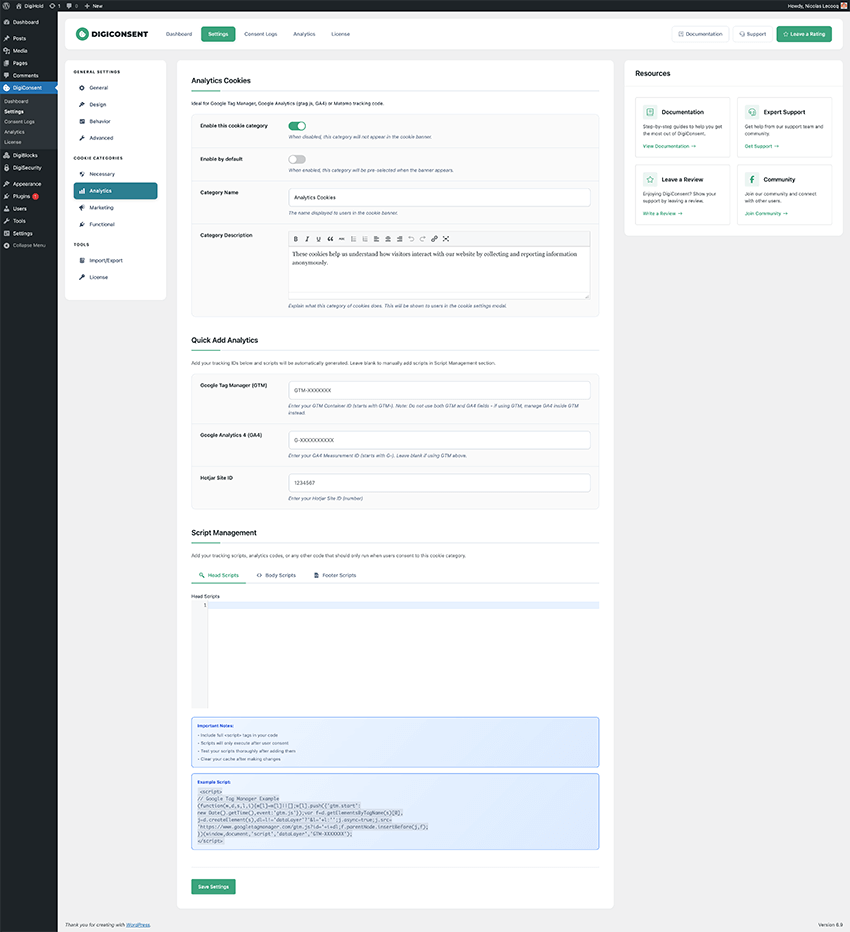 IMPORTANT: DigiConsent itself does not connect to any external services. However, it provides optional integration templates that allow users to add third-party tracking and analytics scripts to their cookie categories. These scripts are only loaded when users provide the necessary IDs/keys and when visitors consent to the respective cookie category.