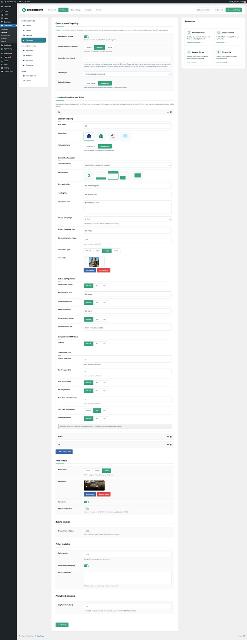 With DigiConsent Pro, you can detect visitor location using MaxMind GeoLite2 database and show different banners to visitors from specific countries or US states. This is useful for showing opt-in banners to EU visitors while showing notice-only banners to other regions. You can create location rules with completely different settings per region.