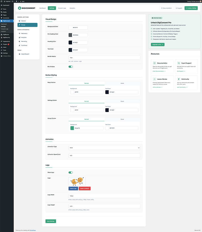 Absolutely! DigiConsent offers extensive customization options including colors (with transparency), animations, positioning, and custom content. You can match it perfectly to your brand. Pro version adds hero media (images/videos).