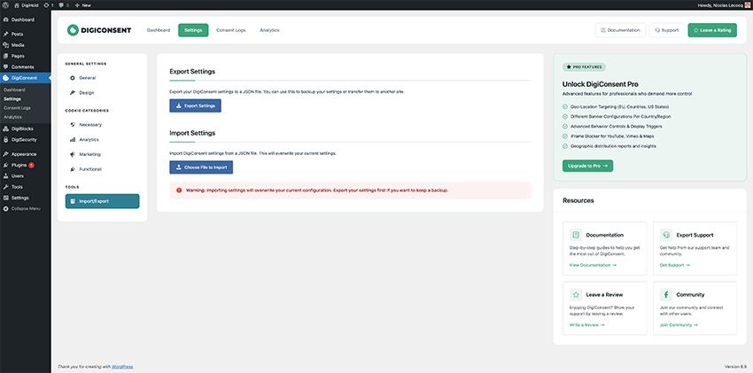 Yes, DigiConsent includes import/export functionality so you can easily transfer settings between websites or create backups of your configuration.