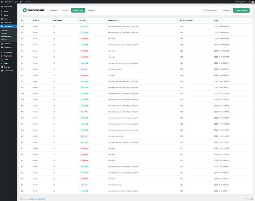 Yes, DigiConsent logs all consent decisions with timestamps, IP addresses (optional), user agents, and consent choices. These logs can be viewed in the dashboard and exported for compliance audits. You can configure log retention period (minimum 30 days).