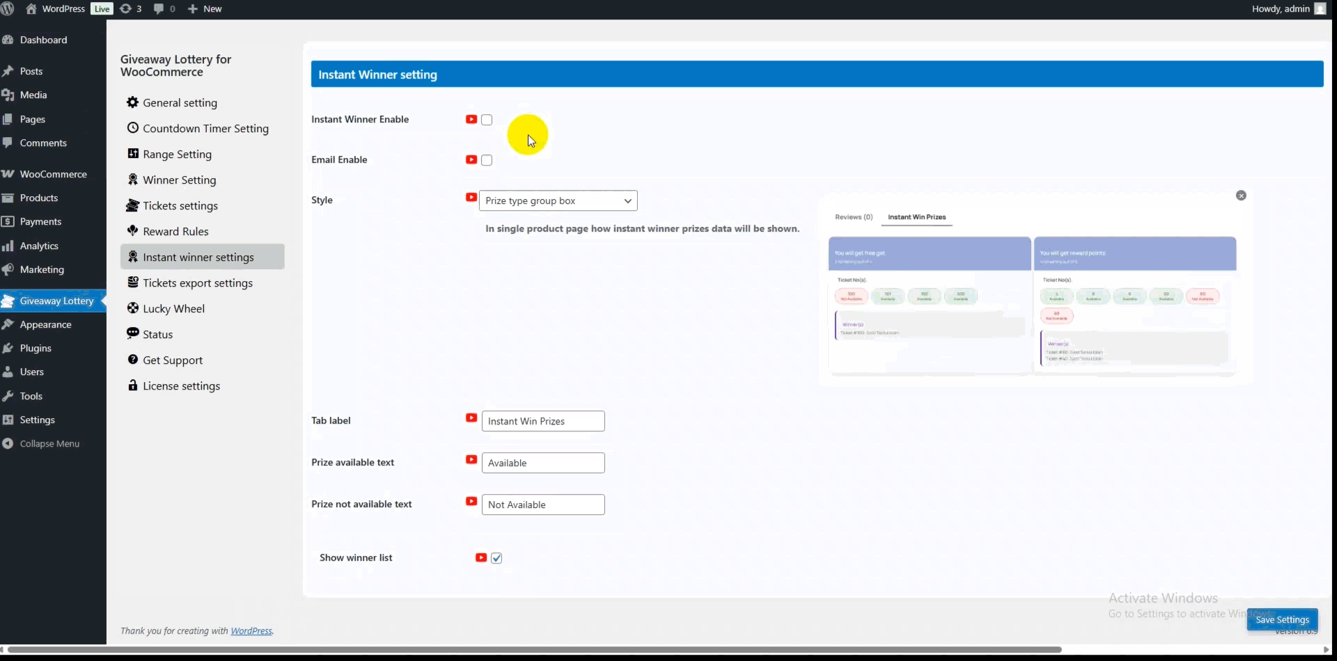 Configure instant winner functionality for immediate gratification! Enable/disable instant wins, customize display styles, set tab labels, and configure availability messages. The system allows you to control whether winner lists are shown and customize the entire user experience for instant prize notifications.