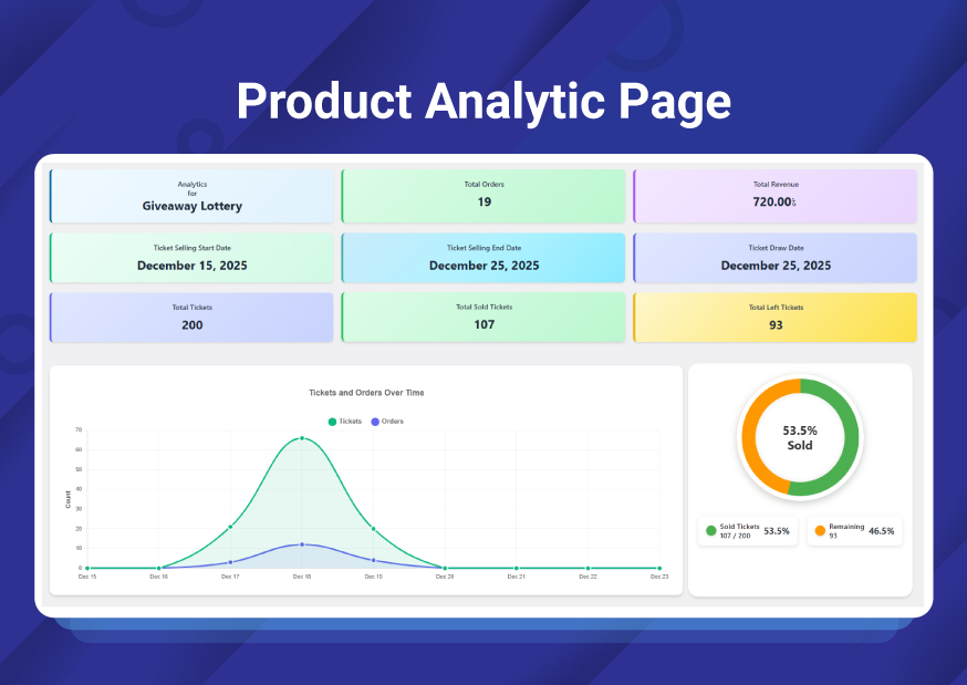 The Analytics Page provides the admin with a complete overview of each giveaway product’s performance. From this section, the admin can clearly see how many sales have been generated, the total revenue earned, the number of orders placed, and how many users have participated. All key insights are displayed in one place, making it easy to track performance, measure success, and manage giveaway campaigns effectively.