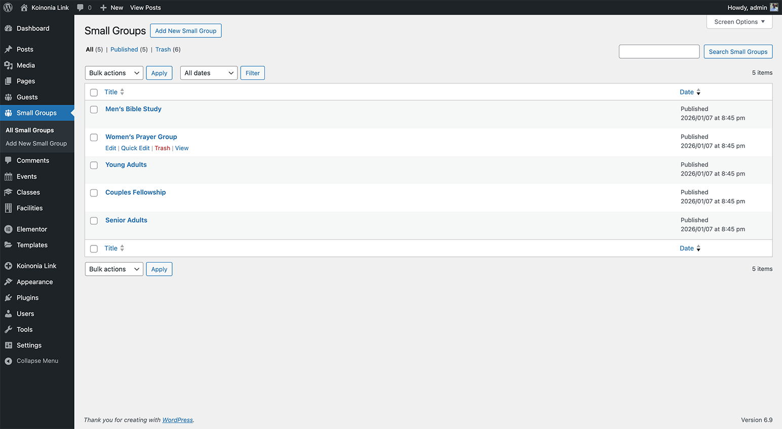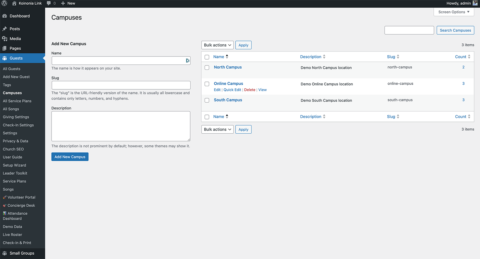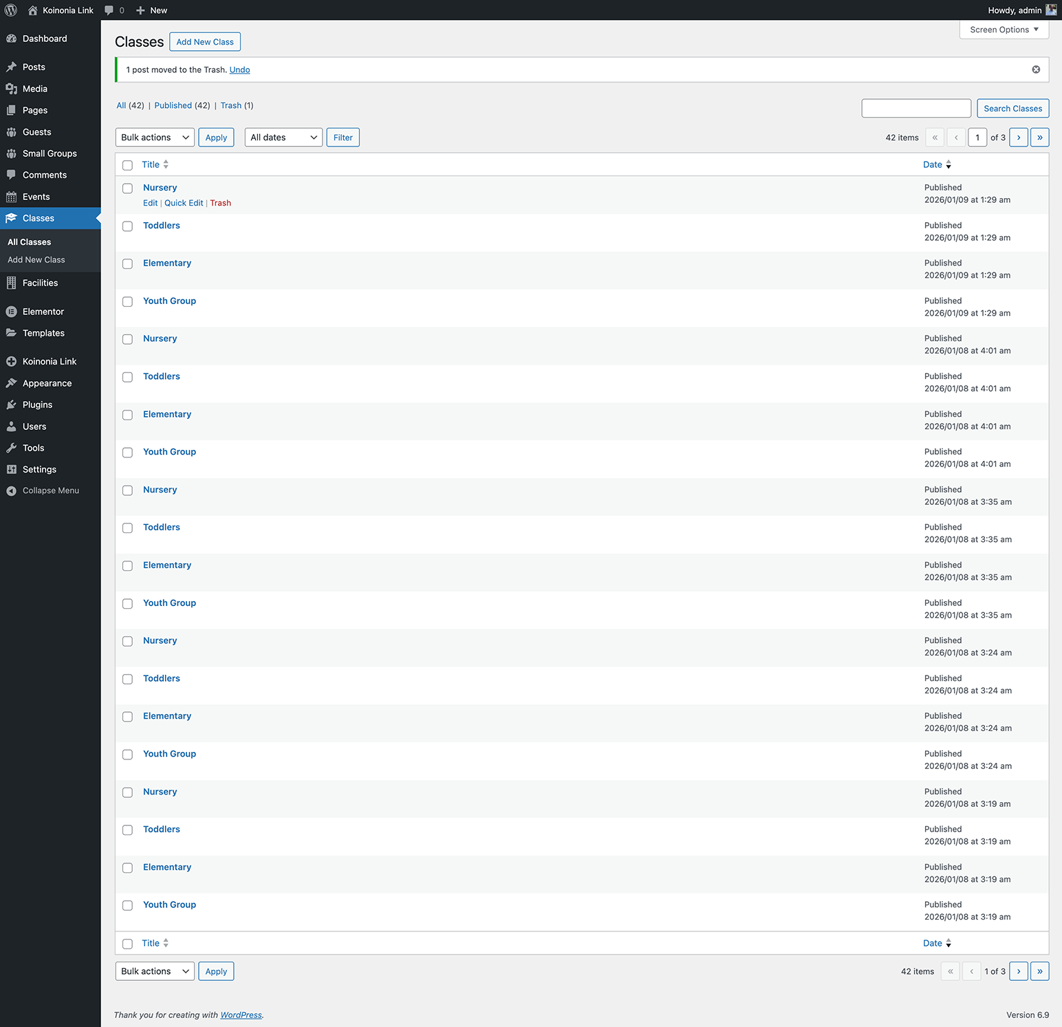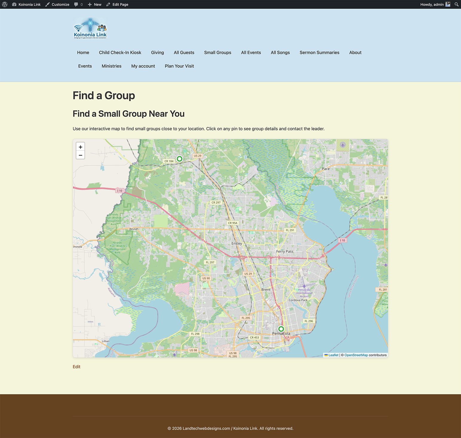 Koinonia Link is a church management plugin for WordPress that helps you track guests, manage groups, publish sermons, run events, handle giving workflows, and coordinate volunteers directly from your website.