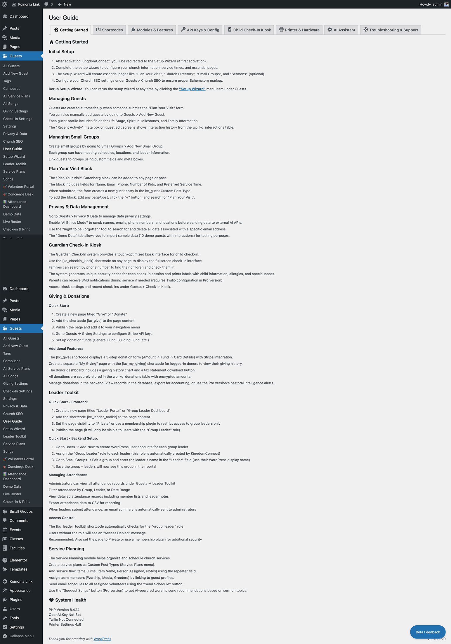 Koinonia Link is a comprehensive church management plugin for WordPress. It centralizes guest follow-up, ministry workflows, and weekend operations inside your website so your team can manage data, communication, and service logistics in one place. The plugin is designed around a “First Impressions” pipeline that moves guests from visit to connection, while also supporting ongoing ministry needs like groups, events, giving, and volunteer coordination.
