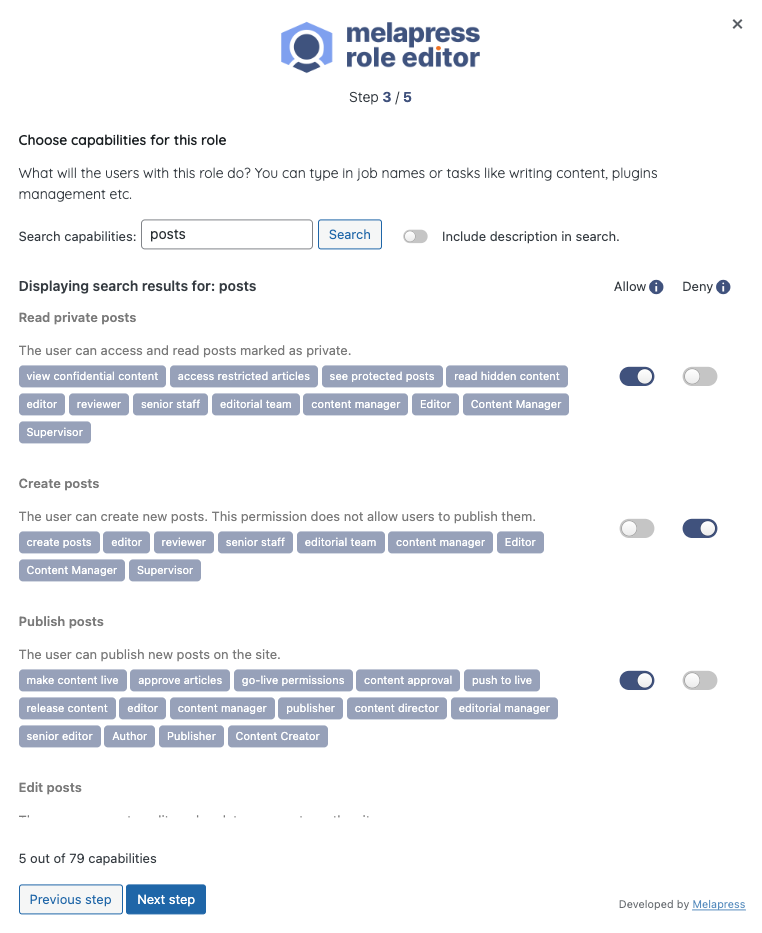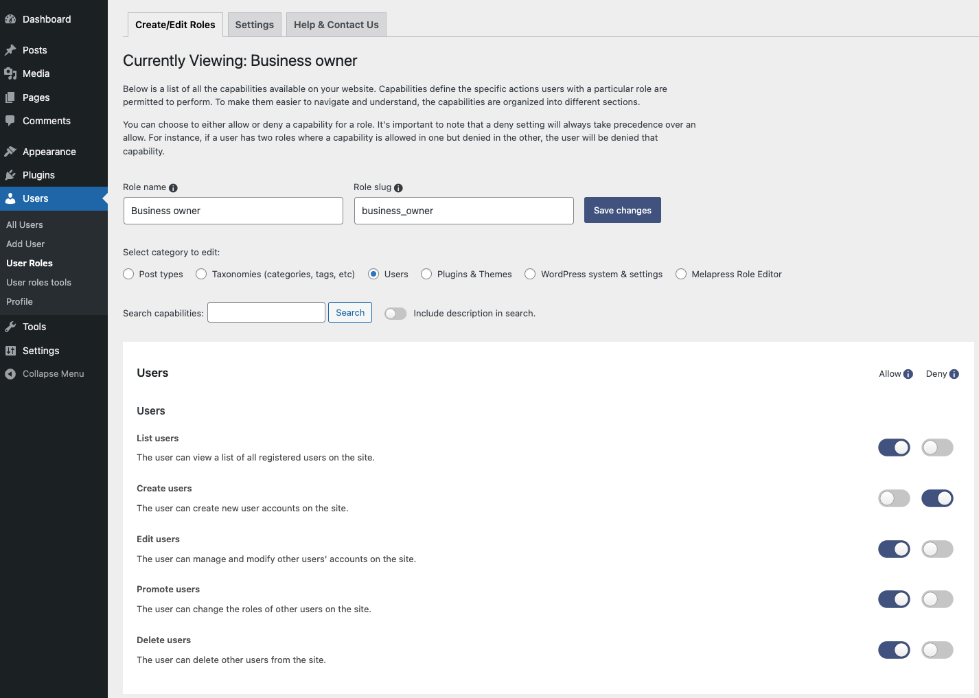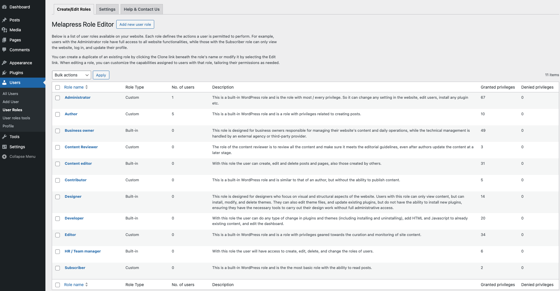 Melapress Role Editor comes with a number of pre-configured roles designed to help you get started quickly. Modeled after common roles in the WordPress business, such as Business owner, Developer, and HR manager, each role has been designed to respect the principle of least privilege while giving you a head start in configuring new custom roles.