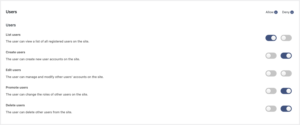 WordPress environments can get pretty complex, so we added features to accommodate every scenario. You can assign users multiple roles to avoid creating additional roles. You can also explicitly deny capabilities to ensure the utmost level of security in complex scenarios.