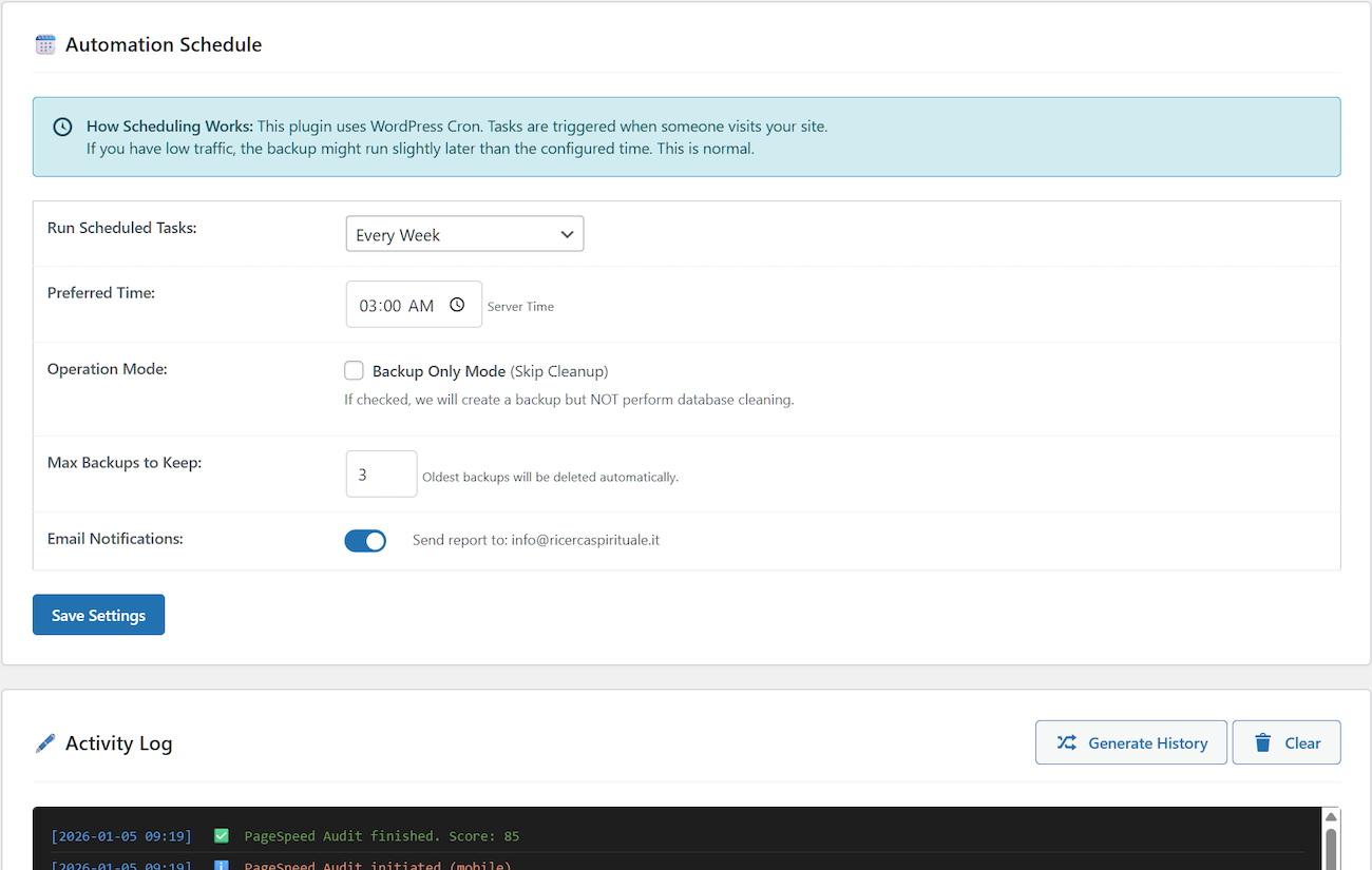 – Automatic Backup + Cleanup – Combined scheduled operations (Pro)