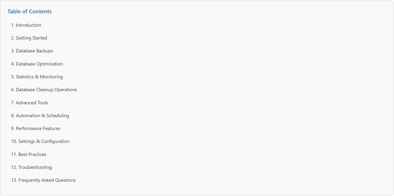 - Core database optimization features: 14 cleanup types, table optimization