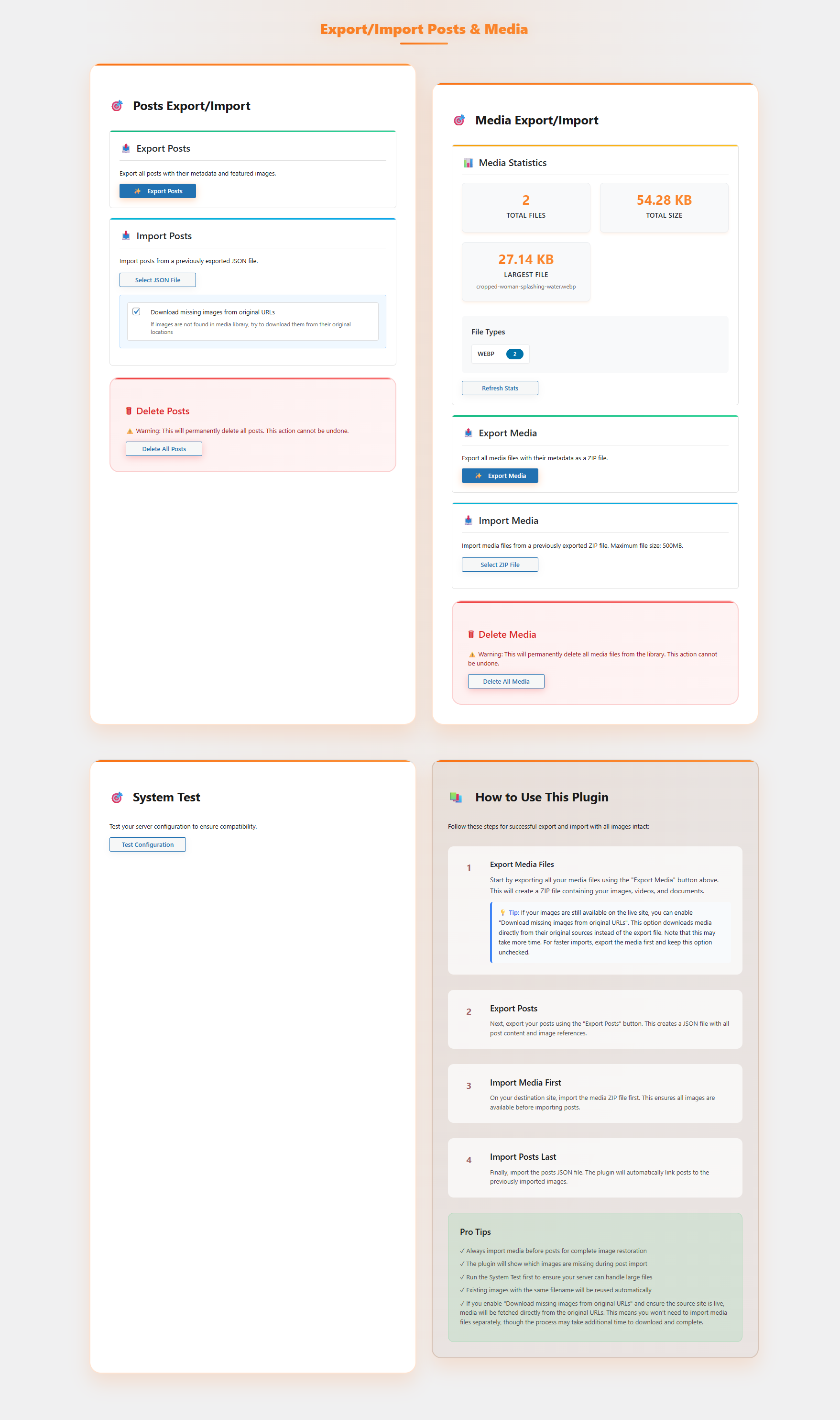 Post Export Import with Media is a simple yet powerful WordPress plugin that helps you securely transfer posts, pages, media, widgets, menus, themes, plugins & settings along with their media files between WordPress sites. Unlike the default exporter, this plugin ensures that images and attachments are included, so you don’t end up with broken links or missing media.