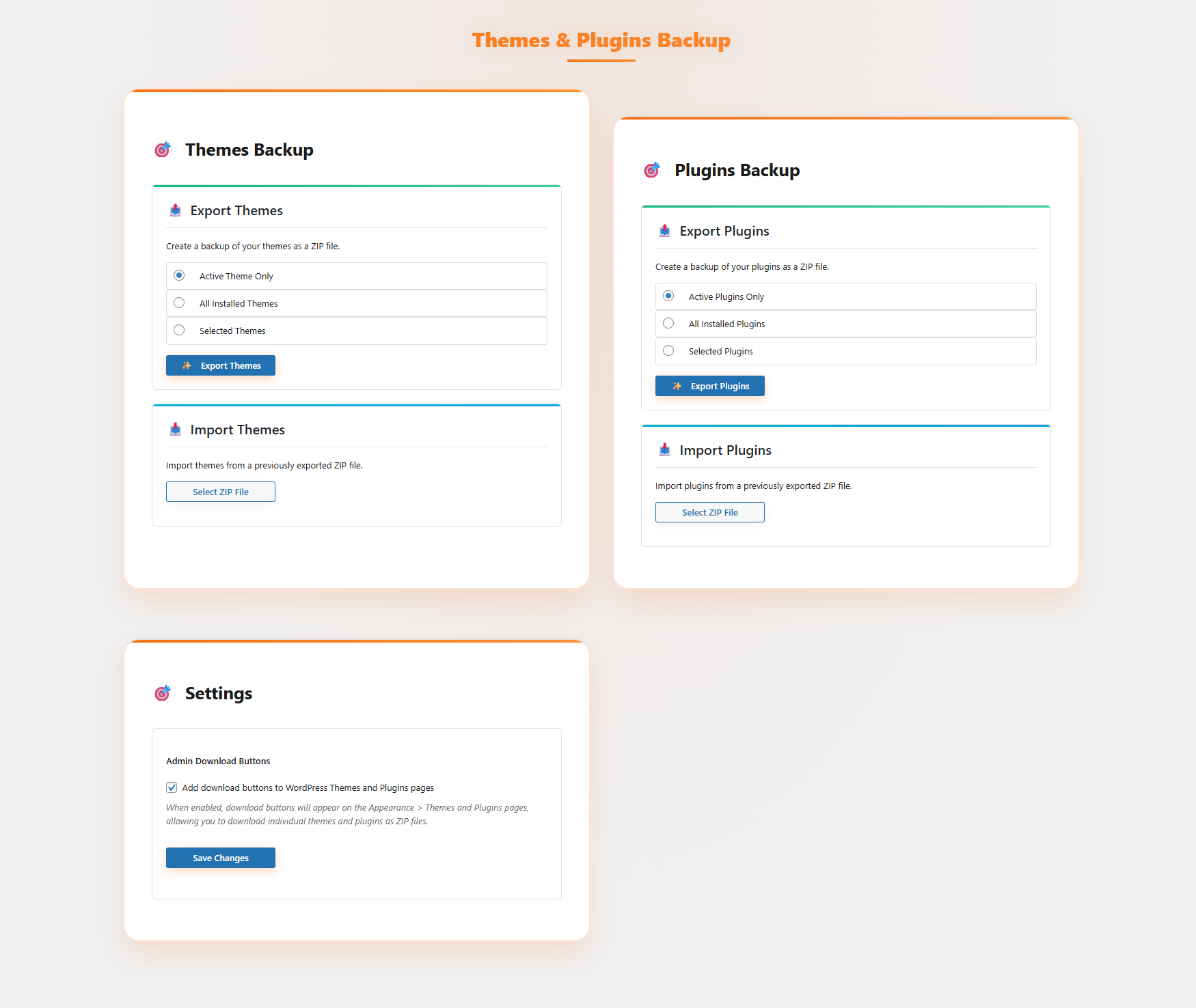- Create backups of installed WordPress themes and plugins