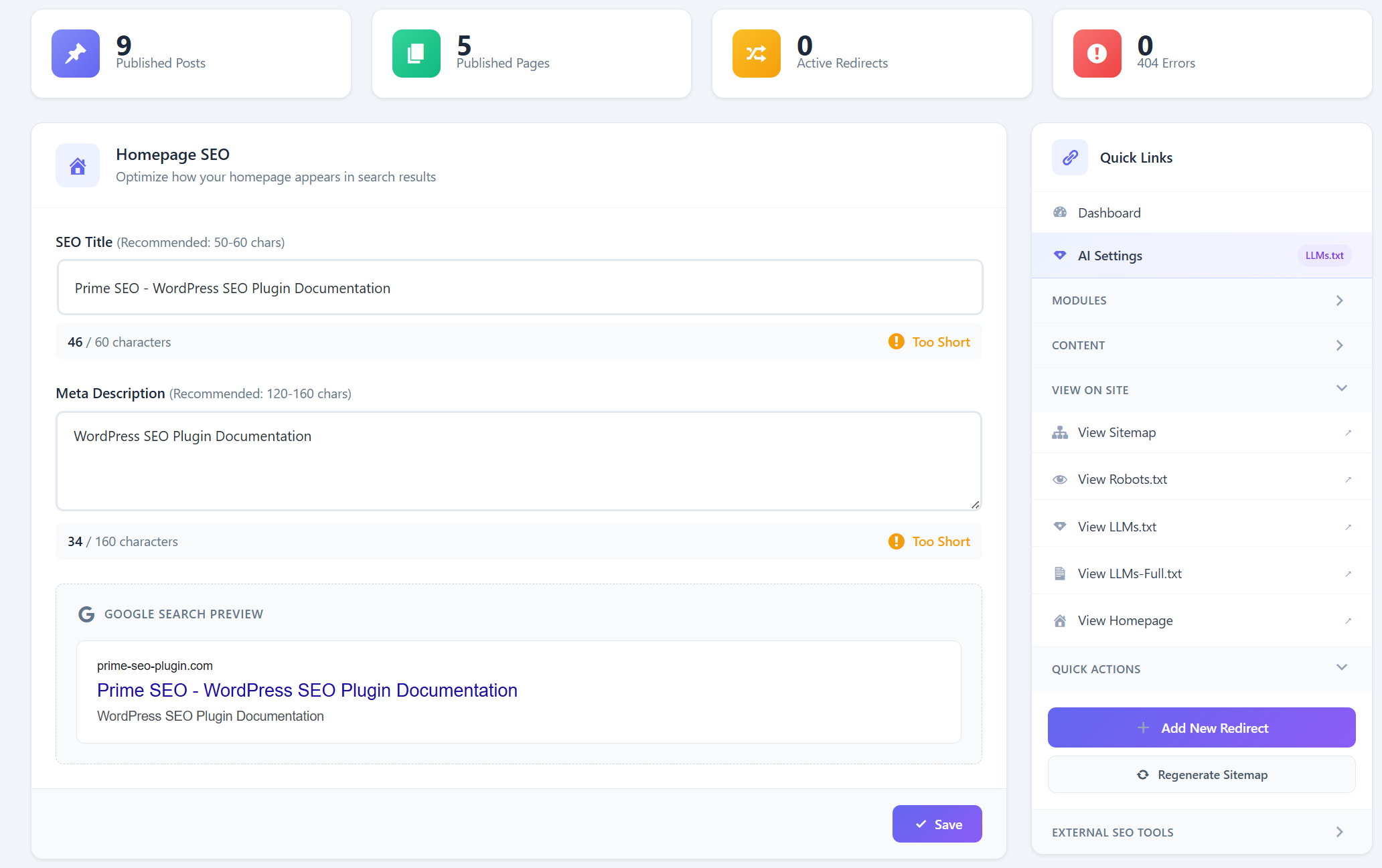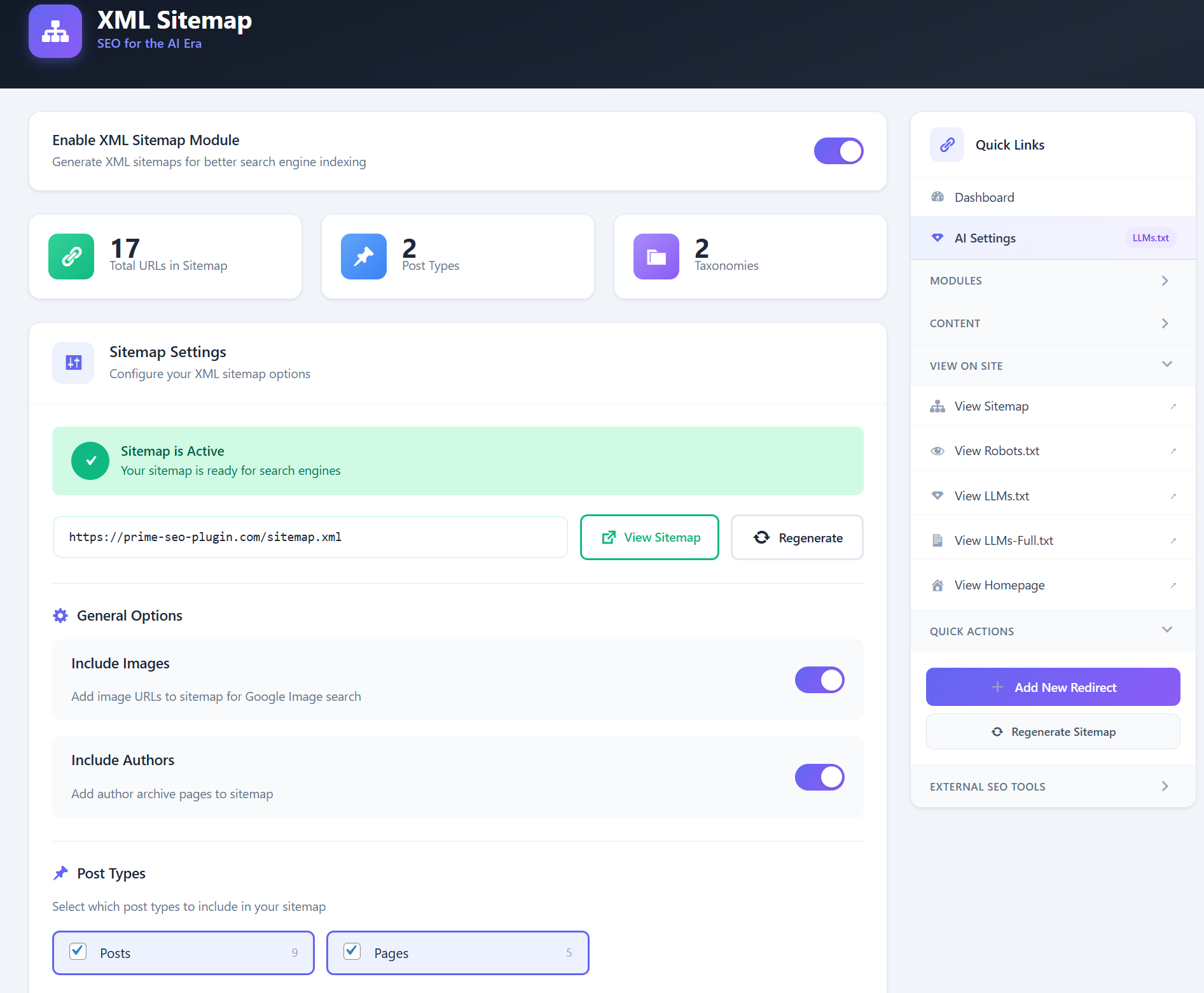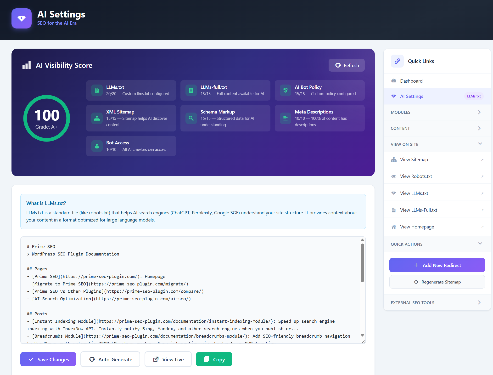 Since 2026, Prime SEO has been built from the ground up for the new era of search — where AI assistants cite sources and answer questions directly. Control how AI sees your content with LLMs.txt, manage 16+ AI crawlers, and optimize your site for both humans and machines.