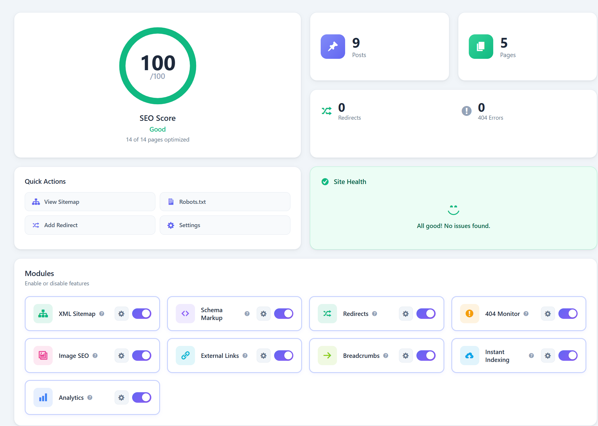 - Fixed: Setup Wizard now correctly saves all module settings (Image SEO, External Links, 404 Monitor)