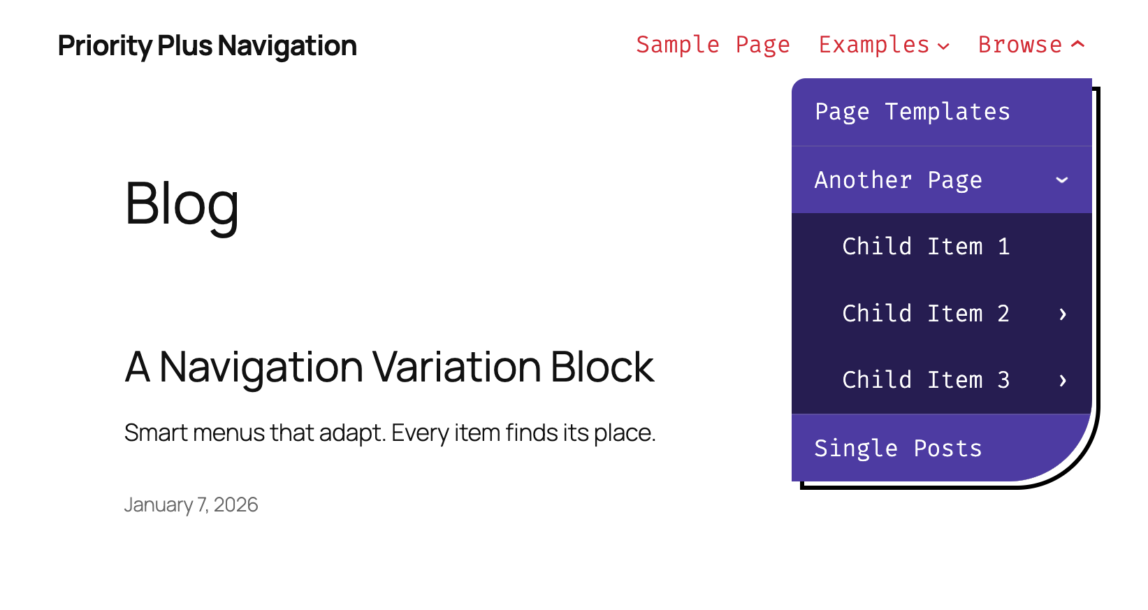 theme.json:{ "version": 3, "settings": { "custom": { "priorityPlusNavigation": { "dropdown": { "backgroundColor": "#f0f0f0", "borderColor": "#999999", "itemHoverBackgroundColor": "rgba(0, 0, 0, 0.08)" } } } } }The plugin provides sensible defaults, and you only need to specify the properties you want to customize. For complete styling documentation, see the GitHub repository.
