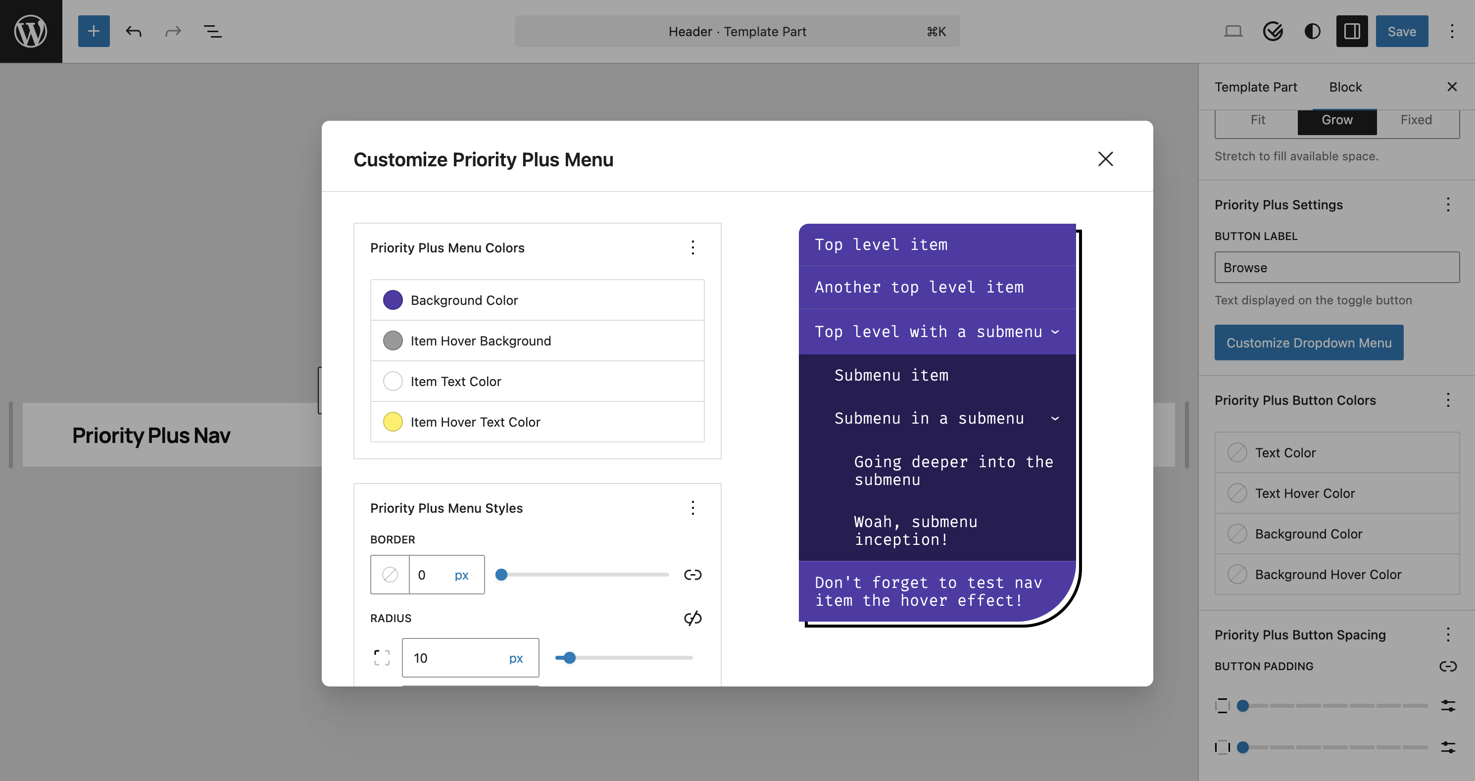 Priority Plus Navigation intelligently integrates with WordPress core navigation overlay menu settings: