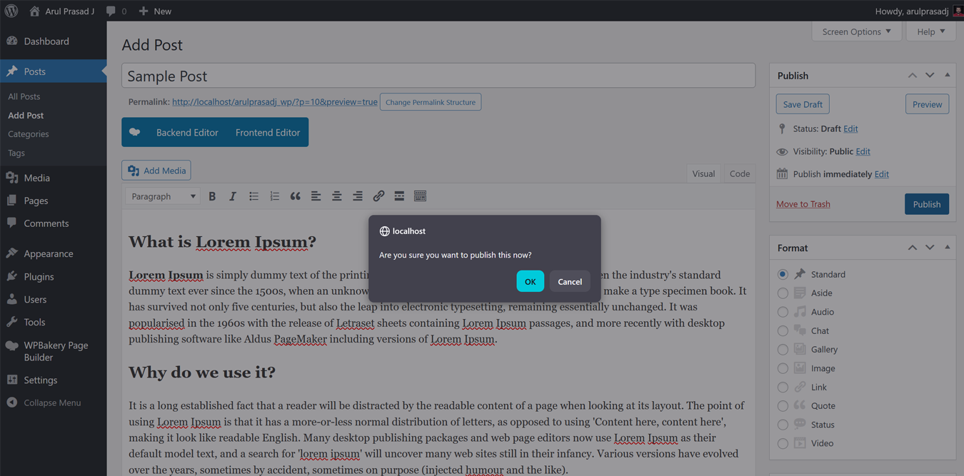 When working with page builders such as Elementor, WPBakery, confirmations are displayed when publishing or updating content via the WordPress editor controls rather than the builder’s own interface.