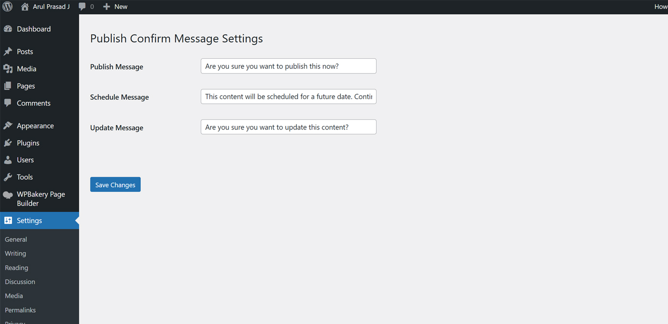- Change the default message through the ‘Publish Confirm Message’ menu in WordPress.