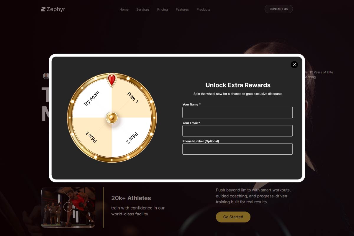 Capture user attention with a customizable Interactive spin wheel for WordPress that appears at the right moment, whether on page load, exit intent, or after a specified period of inactivity.