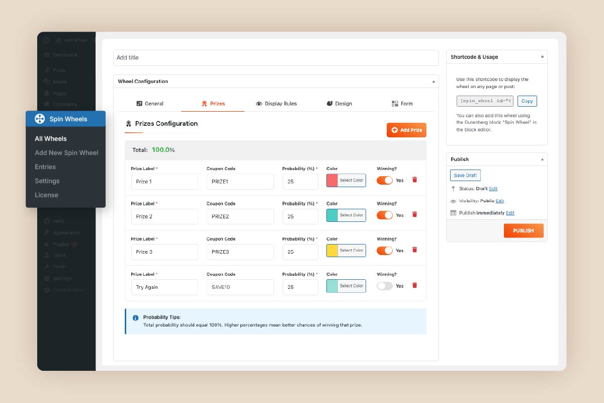 Custom Coupon Labels and Codes: Offer unique prizes with customizable labels and discount codes. - Winning Probability (Coming Soon): Control the odds of winning with adjustable probabilities for each segment.