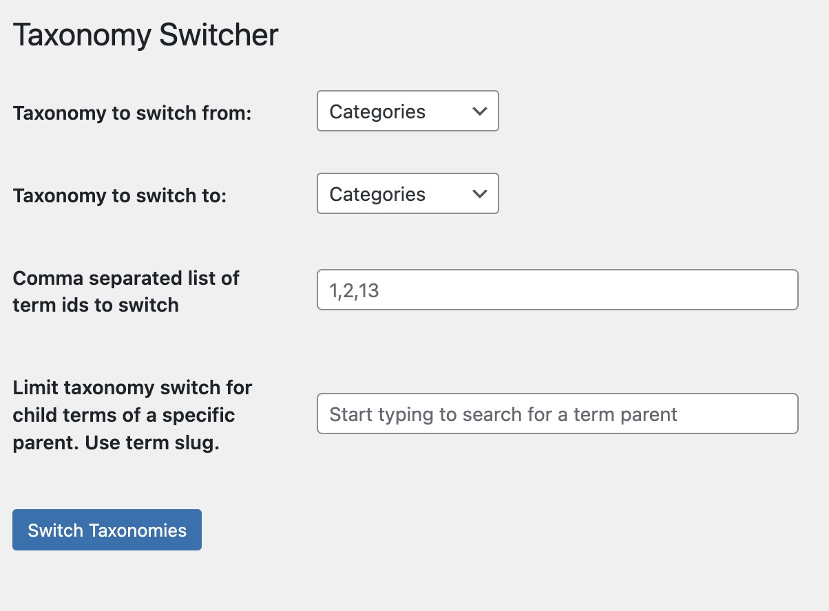 - a) Optionally select a parent term to limit terms to switch. Typing term names will do a live search of terms with the name you are typing AND possess child terms. OR b) Add a comma-separated list of term ids to switch.