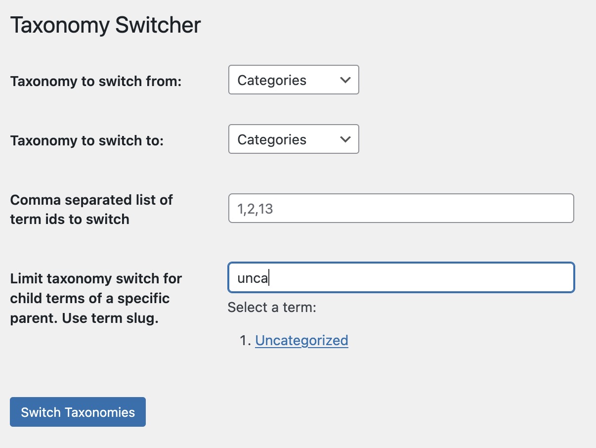 Plugin also has built-in support for WP-CLI. In the command line, type in wp taxonomy-switcher for instructions.