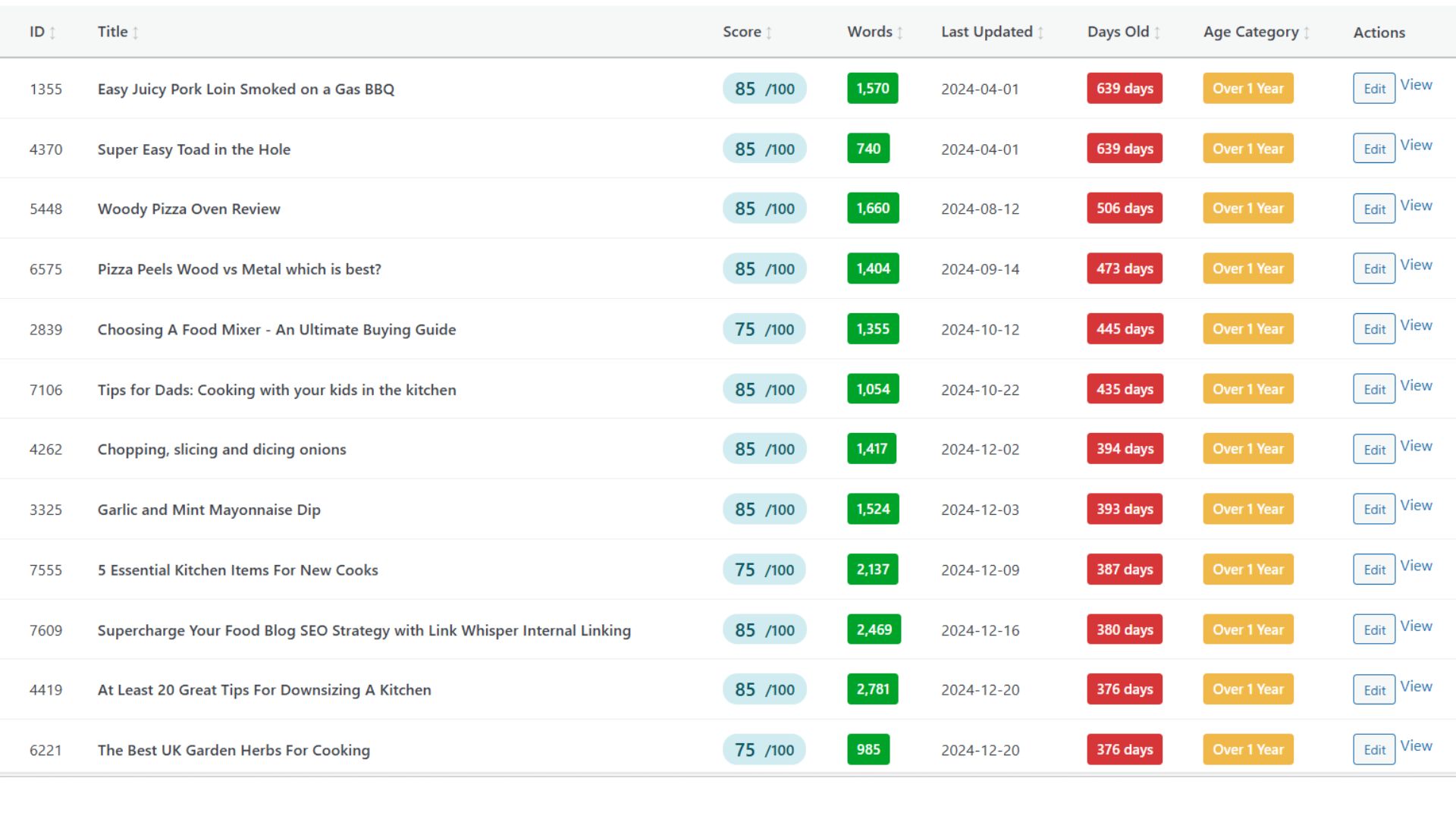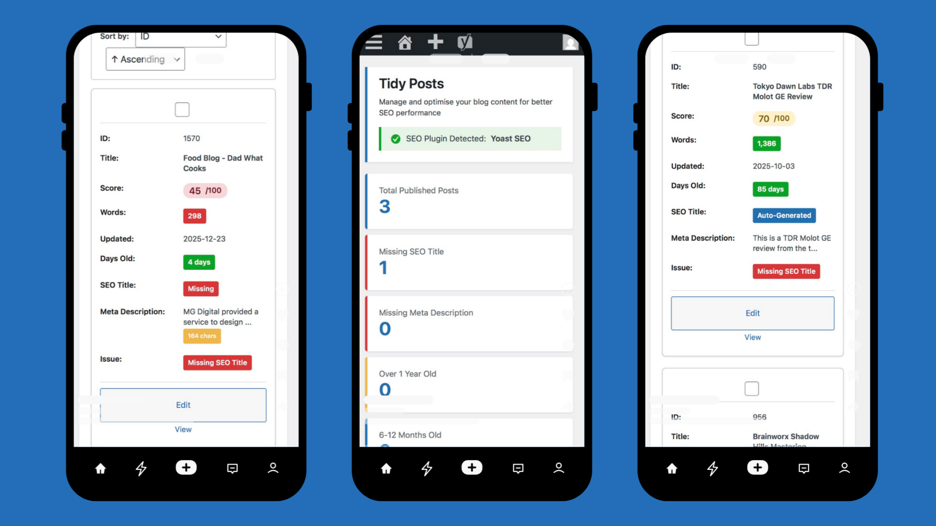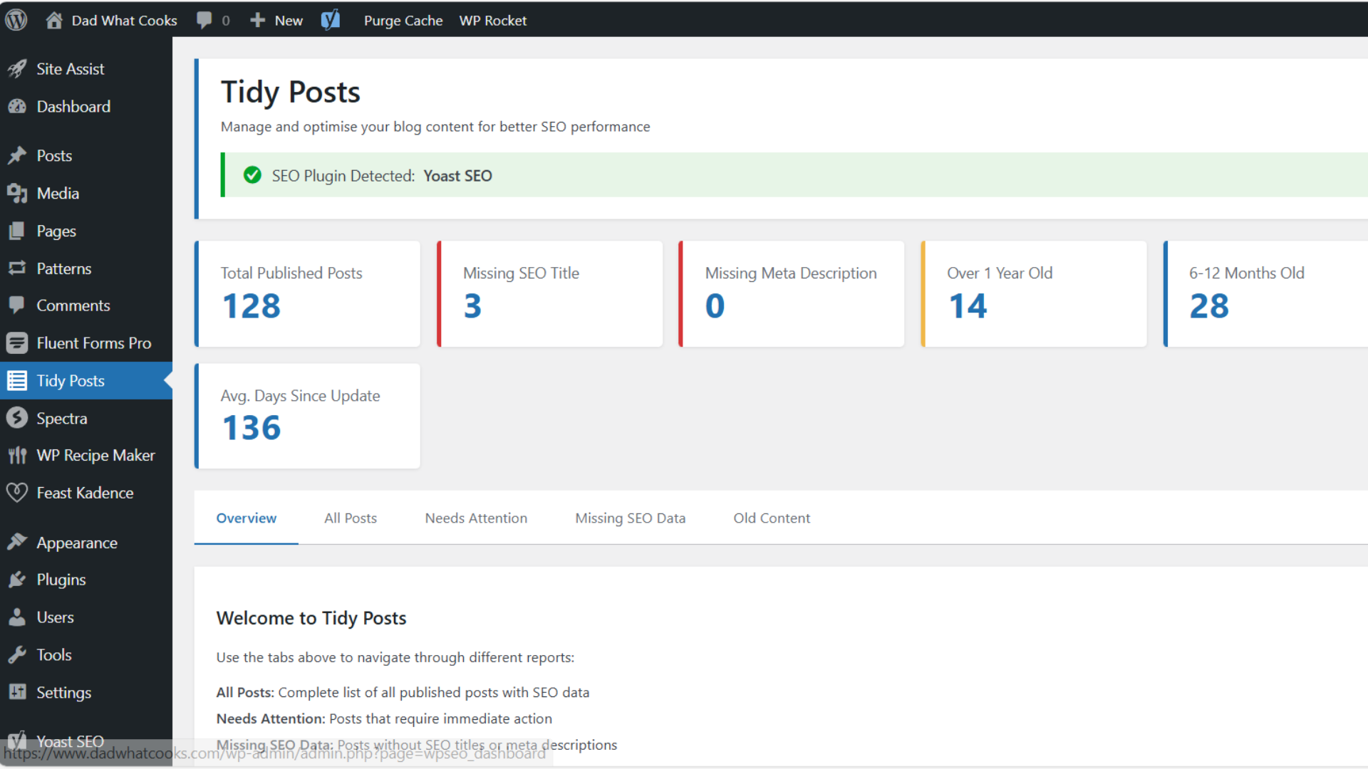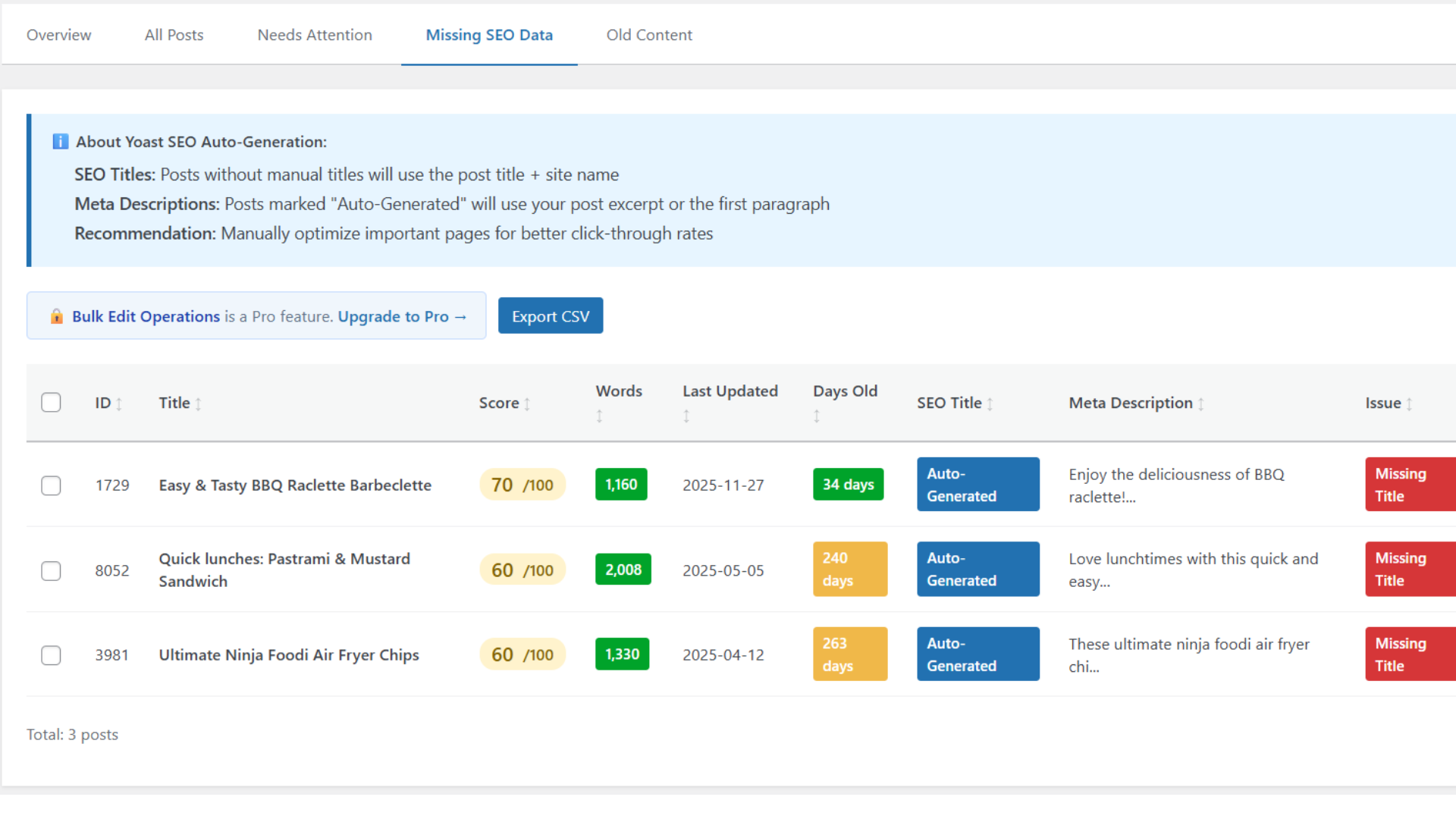 - Multiple Views – Browse all posts, posts needing attention, missing SEO data, or old content