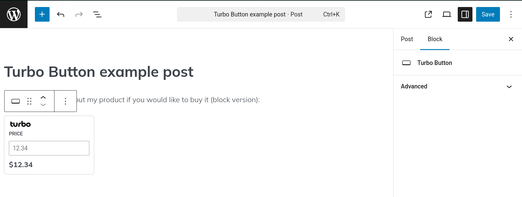 Gutenberg block: In the WordPress visual editor, enter /turbo, then select the Turbo Button block. Enter the price for the link you would like to create. Save the post, and view the page in WordPress. The payment link will now redirect to your Turbo account’s landing page for checkout.