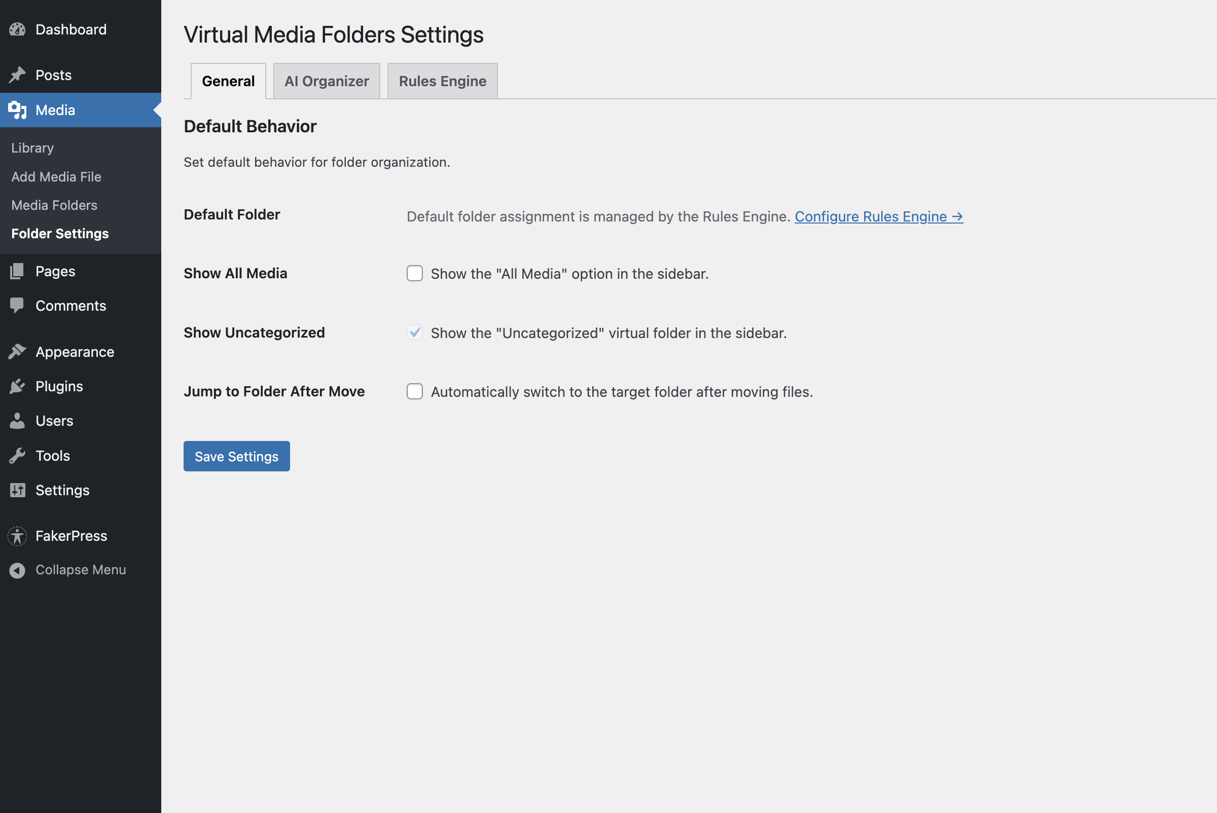- Changed: All settings now functional – Default Folder auto-assigns uploads, Show Uncategorized controls folder visibility, Sidebar Default Visible controls initial state