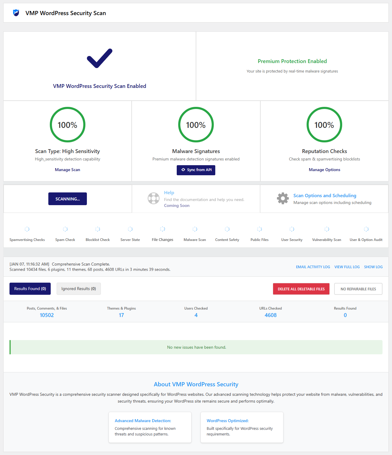 VMP Security is like having a professional security team watching your website 24/7. We combine a powerful firewall, intelligent malware scanner, and advanced threat detection to keep your site safe from hackers, malware, and security vulnerabilities.
