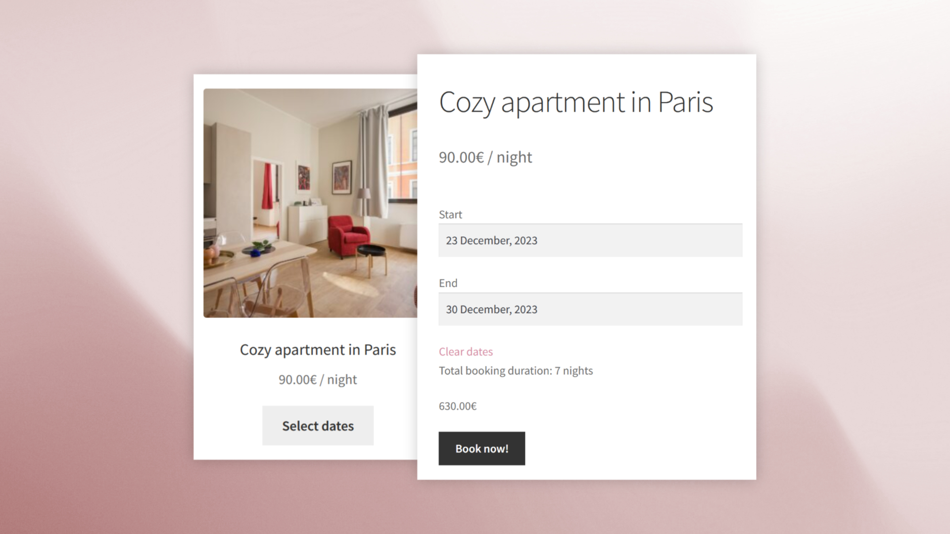 - Date selection on shop page: Let customers choose dates directly from the product listing, with real-time filtering of available products.