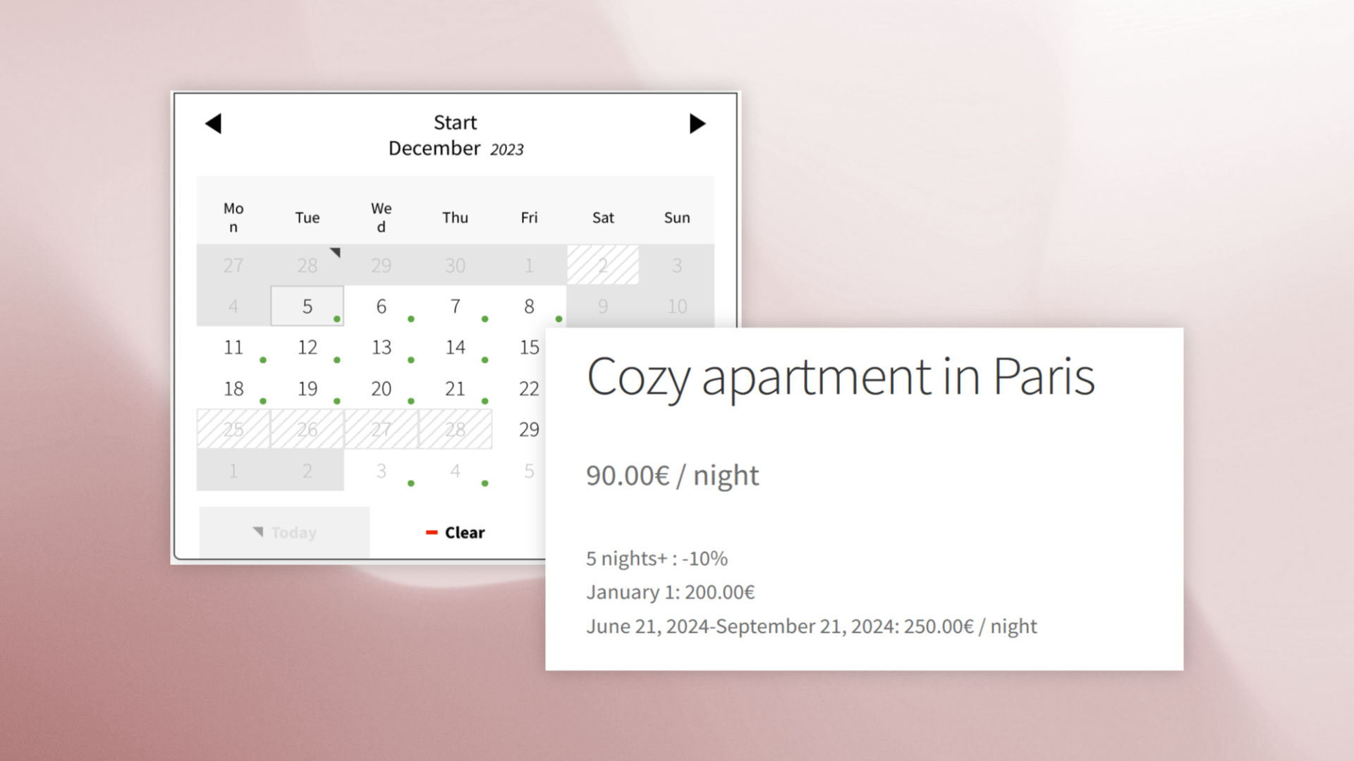 - Flexible booking modes: Choose between Days or Nights mode, and set custom booking durations and limits to match your business model.