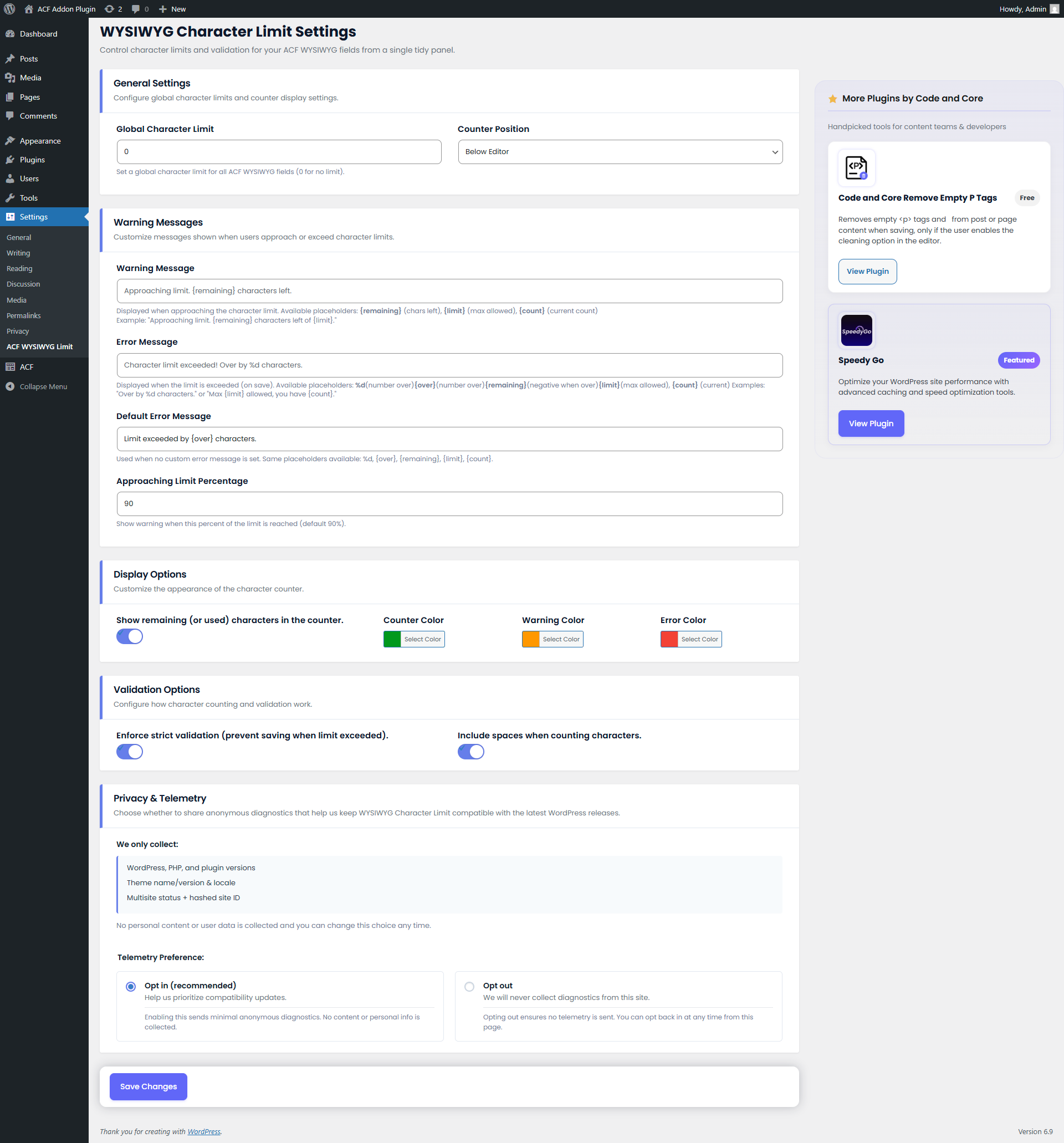 - Go to Settings > ACF WYSIWYG Limit to set a global limit (optional).
