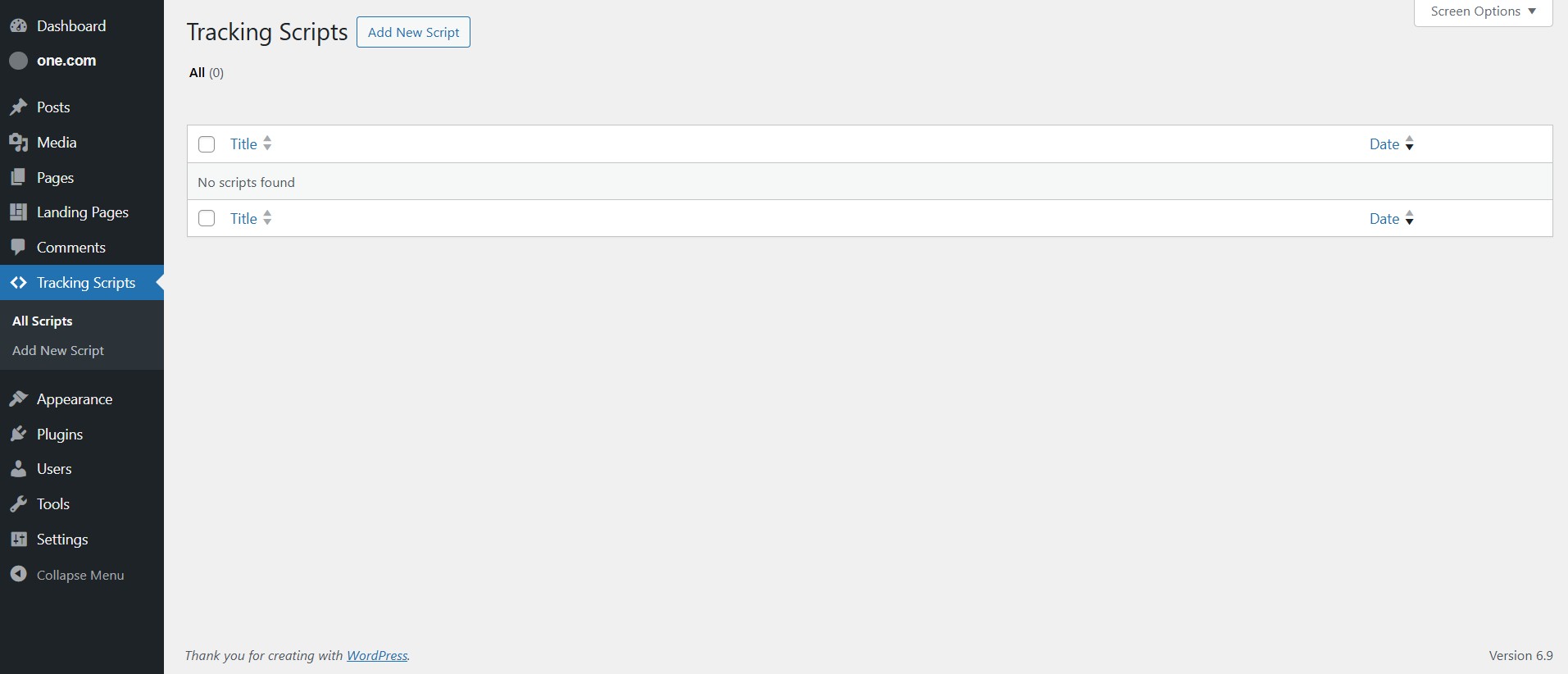 - Open the “Tracking Scripts” menu in the WordPress dashboard to add and manage tracking scripts.